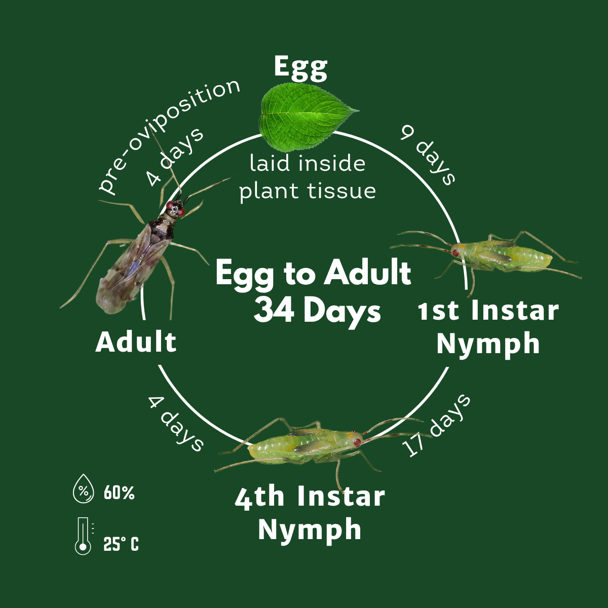 It can also feed on aphids, thrips, mealybugs, spider mites, and other soft-bodied pests. Thanks to its ability to feed on pollen and alternative prey, Dicyphus can stay in the crop long-term, even when pest pressure is low.