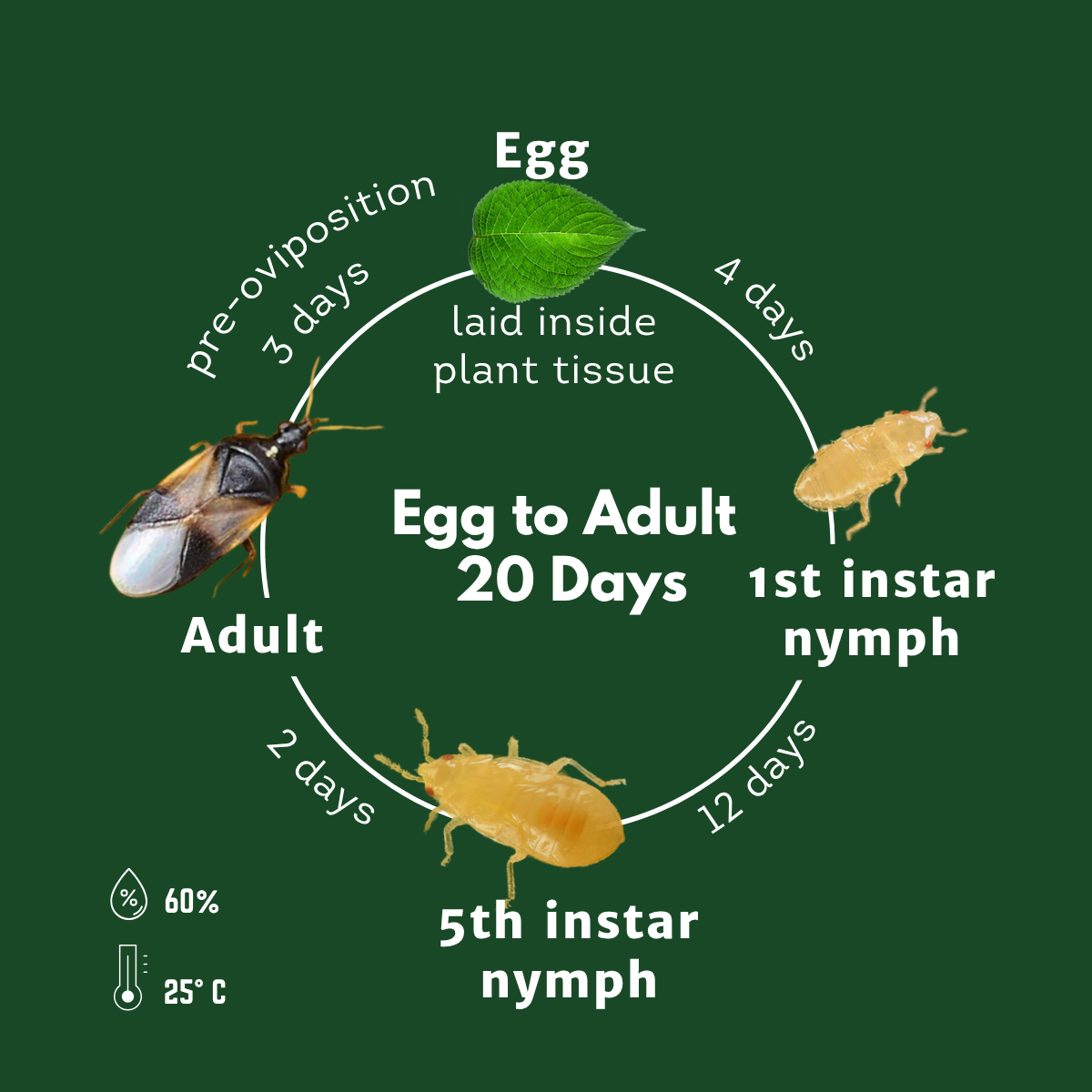 Orius insidiosus is one of the few natural enemies capable of feeding on all mobile stages of thrips, making it especially effective for hotspot suppression. Beyond thrips, it also feeds on a wide range of soft-bodied pests such as aphids, spider mites, mealybugs, and soft scales.